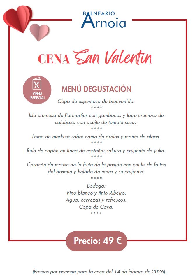 Puedes completar el fin de semana con nuestro pack San Valentín, en el que además de la cena tendréis una noche de alojamiento, desayuno buffet y tratamiento de balneario con acceso a las piscinas de agua mineromedicinal.